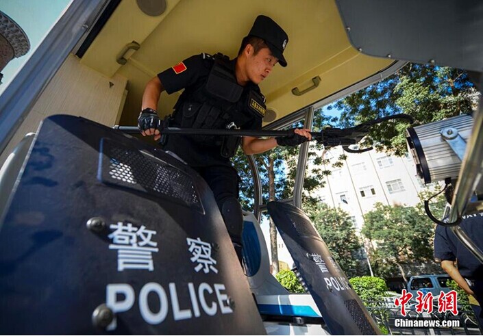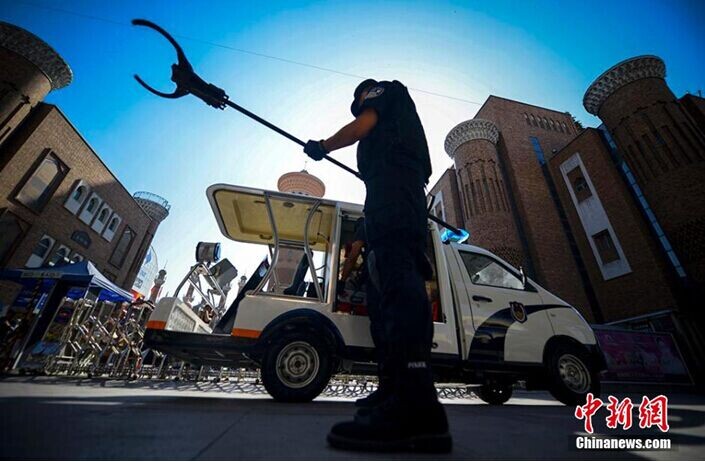 8月28日,一輛新型反恐電動(dòng)巡邏車亮相新疆首府烏魯木齊市國際大巴扎,該車由電力驅(qū)